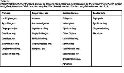 In Table 5.1 the total numbers of the major arthropod groups identified both in Skylark faeces and in suction samples are listed. Besides the groups included in the table, a few Formicidae, Opiliones, Scarabaeidae and Silphidae were found in faeces and suction samples. Also a few Aphididae and Collembola were identified in the faecal samples whereas these groups were not counted in the suction samples (section 3.1.1).