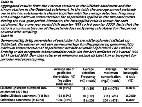 Detection frequency, concentration and loss of 49 pesticides and metabolites were measured during two years (1999 and 2000) in two small Danish arable catchments. The Lillebæk catchment on Funen has an area of 4.35 km2 with 86% agricultural land on loamy soils, and the Odderbæk catchment in Northern Jutland has an area of 11.43 km2 with 83% agricultural land, mainly on sandy soils. Two stream stations were established in the Lillebæk catchment dividing the entire catchment into 2 sub-catchments: an upstream culverted and a downstream sub-catchment with an open stream channel. The fate of pesticides in water, suspended sediment and streambed sediment was measured based on samples/results from 3 stream stations and 3 tile drain stations in the two catchments. The main aggregated results from the two catchments are shown in Tables i-iii.
