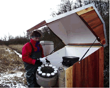 For storm event samples with high concentrations of suspended sediment, the suspended sediment was saved for pesticide analysis. A special sampling device called SubMarie designed for separating suspended sediment and colloids from stream and drain water was installed at the three stream stations (see photo 3.3). The suspended sediment sampler enabled us to extract suspended sediment and colloids during different periods of the year. We collected composite suspended sediment samples at almost monthly intervals during the year of 2000. All sediment samples (streambed sediment and suspended sediment) were brought to the laboratory and kept frozen until analysis.