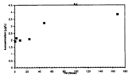 Figur 4.1 Udvikling i koncentrationen af udvaskede stoffer fra jordprøven PbM afbildet som funktion af forsøgstiden