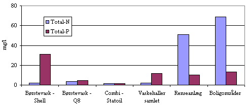 Middelkoncentration af Total-N og Total-P i spildevand fra bilvaskeanlæg i tilløb til renseanlæg og fra boligområder.