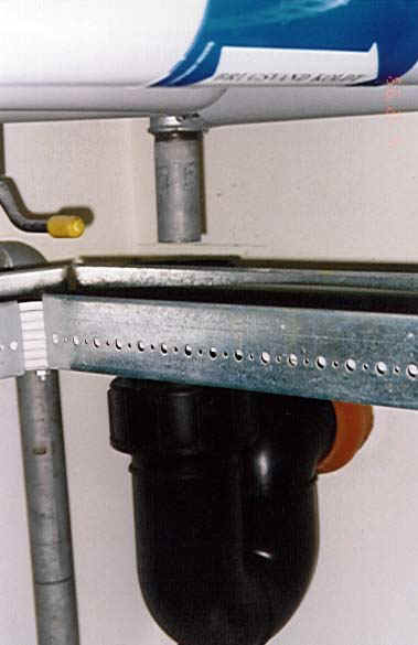 Figur 8.16 En styreenhed, der er installeret under køkkenvasken, af en ikke autoriseret VVS-installatør. Studs på regnvandsnet Som det sidste punkt under listet fejl i starten af afsnit 8.4, er studs på lokalt regnvandsnet medtaget. Det er ulovligt at anbringe en tapventil på det lokale regnvandsnet, men en studs er der ingen regler om, derfor er denne medtaget under projekterings/udførelsesfejl. Når der anbringes en studs på regnvandsledningen øger dette risici for kortslutning mellem det offentlige vandforsyningsnet og det lokale regnvandsnet. Denne studs vil i så fald være anbragt opstrøms pumpen. Hvis indsugningsfilteret stopper til i regnvandstanken, eller der opstår en eller anden fejl, som medfører, at der ikke kan komme vand til wcet, så vil det være naturligt at finde en eller anden måde, hvorpå man atter kan få vand i wcet. Derfor vil det være oplagt at foretage en kortslutning via denne studs på regnvandsnettet til enten tapventilen eller luftgabet på vandværksledningen. Hvis anvisningen fra Teknologisk Institut efterfølges, vil det ikke være muligt at få vand i wcet, før den opstående fejl er udbedret. Sammenligning af fejltræ med og uden studs Foretages en sammenligning af fejltræet for spildevand i det offentlige vandforsyningsnet med og uden en studs på regnvandsnettet, er denne forskel betydelig. Sammenholdes dette med, at sandsynligheden er stor for at en sådan studs indbygges i anlæggene, er det en vigtig faktor at forholde sig til. Figur 8.17: Se her! Betragtes fejltræet på Figur 8.17 ses det, at dette er blevet udvidet sammenlignet med fejltræet vist på Figur 8.12. Fejltræet vist på Figur 8.17 kan ses i større skala i Bilag D. Ny gren tilføres fejltræet Som det fremgår, er der kommet en helt ny gren, som hedder "tryk i lokalt system er større end tryk i offentligt vandforsyningsnet". Denne del er forårsaget af, at der nu er mulighed for en kortslutning mellem det offentlige vandforsyningsnet og det lokale tryksystem. Denne kortslutning kan enten ske via tapventilen på vandværksledningen og studsen på regnvandsnettet eller via enden af vandværksledningen (luftgabet) og studsen på regnvandsnettet. Det er forudsat, at der ikke er placeret andre studse på hverken vandværksledningen eller regnvandsnettet foruden den før omtalte. I et sådant tilfælde kan der opstå en situation, hvor trykket i det lokale net er større end trykket i det offentlige net, og hvis en række fejl indtræffer, kan det ske, at spildevandet ledes ud i vandværksledningerne. For at udgå den forøgede risiko, der er i forbindelse med en studs på regnvandsledningen, kan det overvejes at indbygge en mulighed for at få vand i Wcet, selvom der er et tilstoppet filter eller en anden fejl, der bevirker, at der ikke kan komme regnvand til Wcet. Figur 8.18: Se her! Alternativ anlægsopbygning Betragtes Figur 8.18 ses anlægget vist på Figur 8.1 med den ændring, at det nu er muligt at foretage en omkobling af et ledningsstykke, således at regnvandsanlægget kan afskæres fra wcet og vaskemaskinen. Omkoblingen er vist med de fremhævede stiplede linier på figuren. Lovmæssigt foreligger der nogle regler, som skal følges, når en sådan omkobling skal gennemføres f.eks. er det ikke lovligt, at det er et slangestykke, som skal omkobles. Ved at indføre systemet vist på Figur 8.18, vil incitamentet til at foretage kortslutninger blive reduceret meget. Når fejlen indtræffer, hvor der ikke kan komme vand i wcet, er muligheden for at omkoble systemet tilstede. Dette bevirker, at man ikke selv begynder at lede efter alternative måde at gå uden om regnvandsanlægget på. 8.5 Resultater fra risikoanalyse af regnvandsanlægFormålet med risikoanalysen Formålet med en risikoanalyse er dels at give en beskrivelse af risici i forbindelse med et anlæg, og dels at danne grundlag for at kunne foreslå ændringer i design, som vil kunne reducere de beskrevne risici. Ved at gennemføre risikoanalysen efter disse to retningslinier, er det muligt at lokalisere de største risici i forbindelse med drift og vedligeholdelse af et teknisk anlæg. Ved lokalisering af de største risici er det vigtigt at huske, at det ikke nødvendigvis er den fejlsekvens med det mindste antal fejl, der er den farligste. Det afhænger af sandsynligheden for, at de enkelte fejl indtræffer og konsekvensen af disse fejl. Ved at betragte fejlsekvenser, der fører til den samme konsekvens, kan betragtningerne reduceres til kun at koncentrere sig om sandsynlighederne for de enkelte fejl. Sandsynligheder for de enkelte komponenter At fastlægge sandsynlighederne for fejl ved de enkelte komponenter er en kompliceret affære, og vil kræve en grundig undersøgelse af data fra tidligere anlæg, hvor komponenterne har været benyttet. På basis af disse oplysninger og erfaringer kan der måske dannes et billede af sandsynligheden for hver enkel komponentfejl. Dernæst står man med det problem, at enhederne for hver enkel komponent ikke er den samme. Nogle komponenter er afhængig af tiden, andre er afhængig af brugshyppigheden, hvilket igen komplicere problemstillingen. Det ligger ikke indenfor dette projekts rammer at fastsætte sandsynligheder for hver enkel komponentfejl. Vægtning Det ville dog være spændende at finde de fejlsekvenser med de største risici. Det er derfor valgt at vægte de kvalitative sandsynligheder introduceret i Kapitel 4. Disse var som følgende: