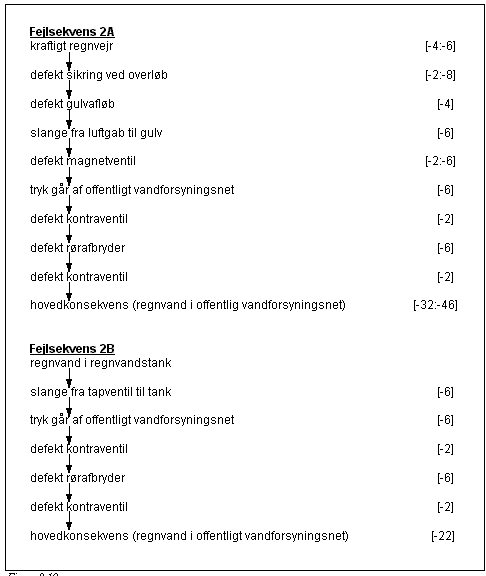 Figur 8.20 To fejlsekvenser fra fejltræ 3 spildevand i det offentlige vandforsyningsnet. Den første fejlsekvens (fejlsekvens 3A) består af 8 fejl og har en samlet vægtning, der varierer mellem 30 og 42. Den anden fejlsekvens (fejlsekvens 3B) består af 7 fejl og har en samlet vægtning, der varierer mellem 28 og 36. Betragtes nu Figur 8.20 ses to fejlsekvenser for fejltræ 3 spildevand i det offentlige vandforsyningsnet. Princippet er det samme som forklaret under Figur 8.19. Fejlsekvens 3B, der er angivet på Figur 8.20, er den mest sandsynlige fejlsekvens, der kan forefindes på fejltræ 3 tilknyttet regnvandsanlægget med hensyn til spildevand i det offentlige vandforsyningsnet. Den fejlsekvens med den største risiko Sammenholdes nu den fejlsekvens fra både fejltræ 2 og fejltræ 3, hvor den samlede vægtning har været lavest, fremgår det, at det mest kritiske sted på regnvandsanlægget er ved tapventilen. Det at rense regnvandstanken med en slange monteret på tapventilen, og så glemme denne nede i tanken samtidig med, at to kontraventiler, en rørafbryder er defekte, og at trykket går af det offentlige vandforsyningsnet, er den fejlsekvens med størst risiko tilknyttet regnvandsanlægget. I tilfældet med spildevand i det offentlige vandforsyningsnet skal der ligeledes ske en opstuvning af spildevand i tanken. Studs på regnvandsnettet Det skal dog bemærkes, at hvis der anbringes en studs på regnvandsnettet, vil fejlsekvensen for en kortslutning mellem studsen og tapventilen ligeledes blive en af de mest kritiske fejlsekvenser, derfor vil det være en fordel at indføre foranstaltningen vist på Figur 8.18 - en mulig omkobling ved fejl på regnvandsanlægget. Tank placeret i kælder Regnvandsanlæg, hvor tanken er placeret i kælderen, er mere sikre anlæg end anlæg, hvor tanken er placeret i jorden. Dette skyldes, at opstuvningskoten for, at spildevand kan trænge ind i tanken, skal være betydelig større, når tanken er placeret i kælderen. Regnvandsanlæg er generelt sikre Udfra ovenstående må det fremhæves, at et regnvandsanlæg opbygget efter Teknologisk Instituts anvisning er et relativt sikret anlæg, og risici for forurening af vandværksvand er ikke stor. Det vil altid være risici i forbindelse med konstruktion/drift/vedligeholdelse af et teknisk anlæg, men sålænge risici er indenfor acceptable grænser, må dette accepteres. Risiko almindelige anlæg Det kan diskuteres, om nogle af disse sikkerhedsforanstaltninger kun burde gælde for husstande med regnvandsanlæg: F.eks. en rørafbryder, som skal forhindre forurenet vand i at trænge ud i den offentlige vandforsyning. Denne ville jo generelt nedsætte risicien for tilbagesug i det offentlige vandforsyningsnet, uanset om der er etableret et regnvandsanlæg i den enkelte husstand eller ej. I alle husstande , hvor der findes en tapventil og et kloaksystem, som er koblet på fællessystemet, er der risiko af tilsvarende størrelse for, at der kan etableres en kortslutning mellem disse to systemer. Et regnvandsanlæg forøger denne sandsynlighed lidt, fordi der opstår ekstra kortslutningsmulighed via luftgabet og via regnvands- tanken, som ikke eksisterer i andre husstande.