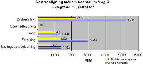 Man kan ikke ud fra opgørelsen alene konkludere, om scenarium A eller C er mest miljøvenlig, da nogle af kategorierne er højest for scenarium A, mens andre er højest for scenarium C. Det er derfor nødvendigt at vægte, hvad der har størst betydning. Der er ikke vist resultaterne af det trin, der i UMIP-metoden kaldes "normalisering", da forfatterne af rapporten har vurderet, at normaliseringen ikke vil bidrage til en større forståelse af systemerne, end den, der kan opnås ved at betragte de vægtede resultater. 7.4.2 Sammenligning mellem scenarium A og C, vægtede resultater I figur 7.1 er forbrugene af energiressourcer vist. Energiressourcerne er vist som "vægtede ressourcer". Se forklaringen i afsnit 6.4.2. Figur 7.1