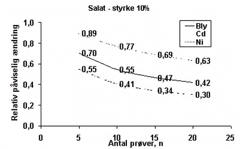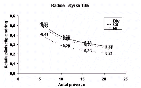 Figur B.5.6 Figur B.5.6 viser, at en fordobling af prøveantallet fra 5 til 10 vil formindske den forskel i middelværdi, der vil kunne påvises for alle afgrøder og alle metaller med undtagelse af cadmium i bønne. For radise og kartoffel, hvor formindskelsen er størst, er der tale om, at der med det nuværende datasæt kan skelnes forskelle mellem middelværdier i størrelsesordenen 50% ændring, hvor der ved fordoblet prøveantal vil kunne skelnes ændringer i størrelsesordenen 40%. Den opnåede forbedring er således begrænset til ca. 10%. Middelværdierne fra Overvågningssystemets data er baseret på et større prøveantal, hvorfor dette vil få større betydning for antallet af frihedsgrader og dermed t-testens styrke end prøveantallet fra forsøget. Endvidere er der for de fleste afgrøder og metaller større variation inden for data fra Overvågningssystemet end inden for data fra den enkelte jord i forsøget. Ved sammenligning af middelværdier fra forsøget med middelværdier fra Overvågningssystemet vil variationen inden for datasættet fra sidstnævnte derfor have større betydning for udfaldet af en t-test end antallet af prøver fra forsøget. Der ses således ikke at være dokumentation for, at analyse af flere prøver fra forsøget vil forbedre styrken af de statistiske analyser væsentligt. |