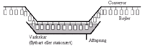 Efter endt slagtning fyldes karret med rengøringsmiddel og conveyorsystemet sættes i gang. Når hele "kædelængden" har været igennem karret og rengøringsmidlet har haft en passende reaktionstid (normalt min 15 min.) fyldes karret med rent vand som afskyller bøjlerne. Conveyorsystemet standses når afskylningen er afsluttet. Hvis pladsforholdene ikke tillader permanent opstilling af vaskekarret kan dette monteres på hjul således at det kan stilles til side i produktionstiden. Conveyorsystemet er opdelt i selvstændige systemer for henholdsvis uren og ren afdeling, men yderligere opdeling kan dog forekommen. Hvis pladsforholdene tillader det bør der opbygges et vaskesystem med kar for hvert af disse systemer. Indførelse af dette system vil normalt kræve ombygning af conveyorsystemet og kan med fordel etableres hvis der af produktionsmæssige grunde skal foretages ændringer på conveyoranlægget. |
