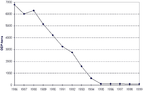 HCFC 22 is primarily used as refrigerant and HCFC-141b and HCFC-142b is used only for foaming. In figure 2.1 is shown the development of the ODP-weighted consumption.