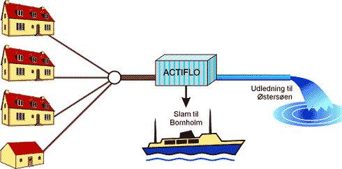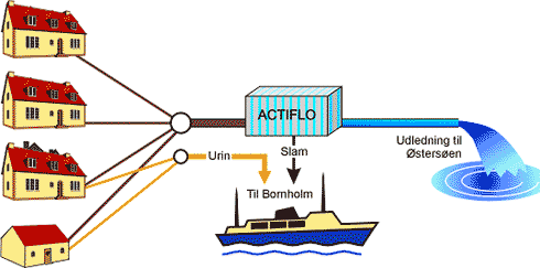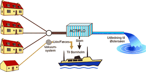 Løsningen omfatter urinopsamling fra den tætte bebyggelse og de offentlige toiletter. Det resterende spildevand renses i Actiflo-anlæg på Frederiksø. Samtlige udløb samles i en fælles ledning og ledes til Actiflo-anlæg. Urin og slam fra Actiflo-anlæg sejles til Bornholm.