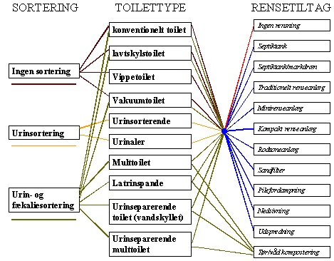 I det følgende gennemgås mulige spildevandsløsninger udfra graden af sortering, den fysiske udformning (toilettype) samt mulige rensetiltag. Spildevandssystemerne er af hensyn til overskueligheden opdelt i: