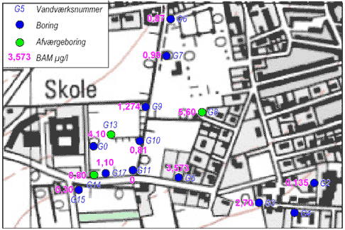 boringer (G8, G13 og G14). På figur 1 er vist forureningssituationen med BAM i