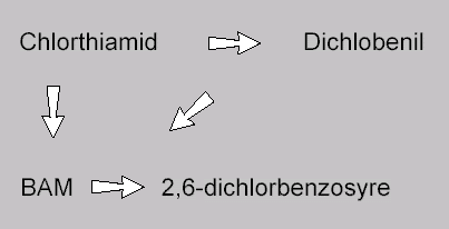 Nedbrydningsveje for chlorthiamid, dichlobenil og BAM