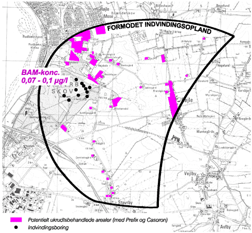 BAM-forurening kan være fordelt i indvindingsoplande, som repræsenterer henholdsvis et