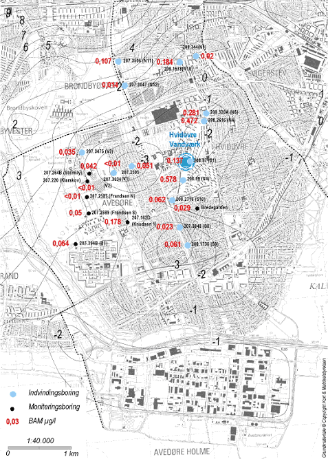 Hvidovre Vandværk indvinder årligt ca. 800.000 m3 grundvand fra boringer spredt ud over hele Hvidovre Kommune inkl. Avedøre-området. Kildepladsen indbefatter 14 boringer, hvoraf 5 boringer i de seneste år er taget ud af drift bl.a. på grund af forhøjet nikkelindhold og for en enkelt boring på grund af høje BAM-indhold (på op til 0,79 µg/l i 1999). Herudover eksisterer der en række enkeltanlæg (boringer) i indvindingsoplandet med en samlet indvindingsmængde på ca. 50.000 m3/år, hvor flere af boringerne løbende moniteres for indhold af pesticider. På figur 4.1 er vist forureningssituationen med BAM i grundvandsmagasinet målt i efteråret 2000 fordelt på henholdsvis indvindingsboringer og øvrige boringer. Som det fremgår, er der påvist BAM i næsten alle boringer. For at kunne levere rent vand til borgerne har Hvidovre Vandværk gennem de seneste år fået midlertidige tilladelser til at rense grundvandet ved hjælp af aktiv kulfiltrering.