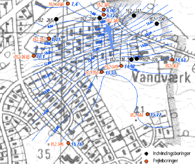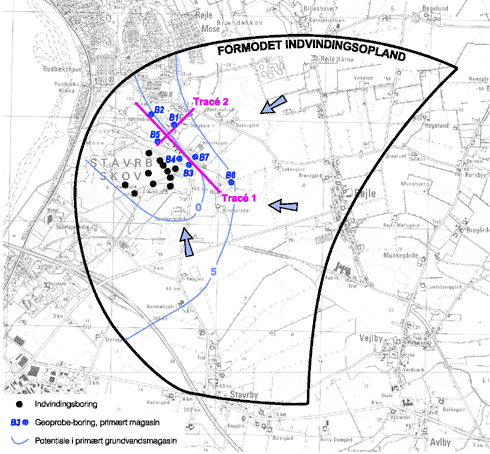 Der indvindes grundvand fra den prækvartære Danienkalk, og det dybere beliggende tertiære skrivekridt JWL. Toppen af kalken træffes i kote ca. –5. Potentialet er beliggende i omkring kote ca. +2 (rovandspejl) svarende til ca. 5,5 m u.t. Magasinet er spændt. Tykkelsen af morænedæklaget synes ifølge optegnelser fra boreprofiler at variere fra 10 til 16 m. Der er i flere af boreprofilerne noteret et gruslag beliggende i moræneleren. Dette gruslag kan eventuelt udgøre et sammenhængende sekundært magasin.