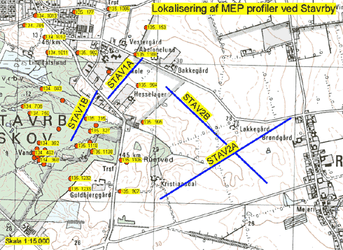 MEP profillinie ES1 er placeret syd for kildepladsen i indvindingsoplandet til det terrænnære grundvandsmagasin. ES2 og ES3 er placeret nord og nedenfor kildepladsområdet. Resultater af målingerne er vedlagt i bilag C sammen med en beskrivelse af målemetoden og en mere detaljeret tolkning.