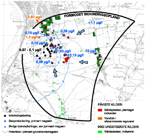 Undersøgelserne synes at pege i retning af, at hele det bebyggede område (veje og villakvarteret) samlet set udgør en række tætliggende kilder til den konstaterede BAM-forurening i det øvre og mellemste grundvandsmagasin på kildepladsen.