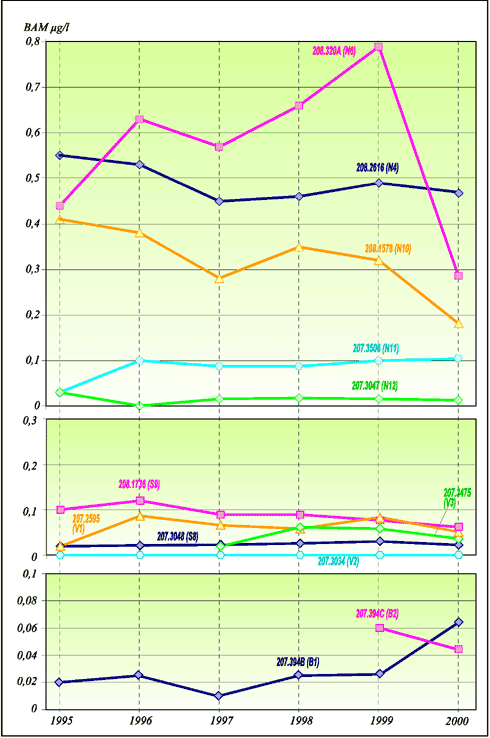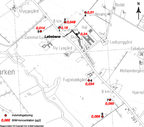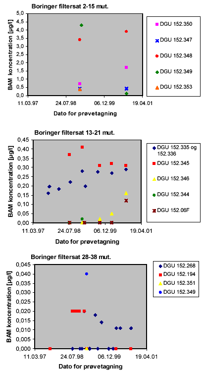 Det ses, at der i de øvre terrænnære moniteringsboringer, som er filtersat 2-15 m u.t. er målt en markant BAM forurening med koncentrationer helt op til 4,3 µg/l. BAM-koncentrationen i indvindingsboringerne i det øvre magasin samt i moniteringsboringerne filtersat 13-21 m u.t. viser generelt en svag stigende tendens med koncentrationer op til 0,41 µg/l. Endvidere ses, at der tillige er detekteret BAM i indvindingsboringer og moniteringsboringer filtersat i det mellemste magasin, men her er koncentrationerne under grænseværdien. Endvidere er der i 1998 målt for BAM i de nærliggende vandløb, hvor der i Hummelgårds Bæk er målt mellem 0,12-0,21 µg/l og i Hedegårds Bæk er udført en enkelt måling på 0,03 µg/l.