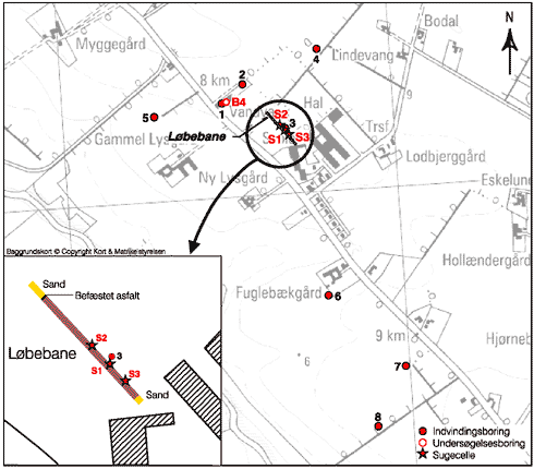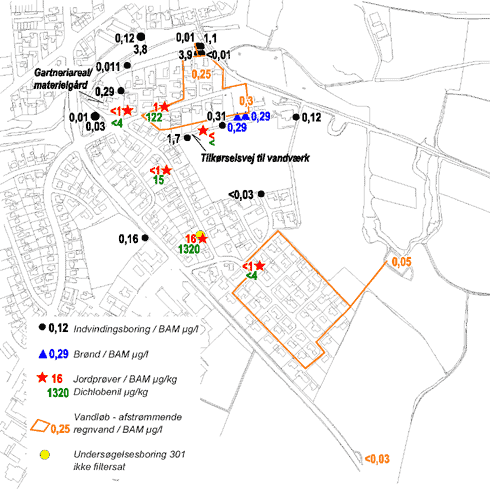 Tilkørselvej til vandværket (se situationsplan, figur 4.17): På den gamle tilkørselsvej er der udtaget jordprøver tre forskellige steder i dybderne 0-0,25 m u.t. og 0,5-0,75 m u.t. Prøverne er analyseret som blandingsprøver for hver dybdeinterval, men dichlobenil og BAM er ikke detekteret. Ved en forespørgsel hos vandværket om forbrug af bekæmpelsesmidler på den gamle tilkørselsvej er oplyst, at der ikke er kendskab til brug af ukrudtsmidler langs vejen. Alt peger derfor i retning af, at BAM-forureningen ikke stammer herfra, og den gamle tilkørselsvej anses derfor ikke for at være kilde til forureningen.