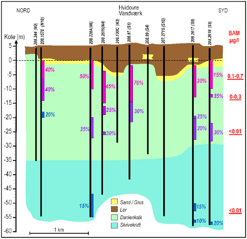 Der er udført niveaubestemt prøvetagning med analyse af bl.a. BAM, og det påviste koncentrationsinterval er vist på figur 4.3. Som det fremgår, er BAM-indholdet størst i toppen af kalken (over pumperne i boringerne) på op til 0,7 µg/l. I den øverste del af Danienkalken ligger BAM-koncentrationen på 0-0,3 µg/l, hvorefter der i den nedre del af Danienkalken og i skrivekridtet ikke er konstateret BAM. De udførte CFC-dateringer peger i retning af, at vandet i Danienkalken er 30-40 år gammelt, og at vandet i skrivekridtet er 50 år gammelt – muligvis ældre. Det vurderes, at det ikke er forsvarligt at relatere CFC-aldersbestemmelserne med alder på pesticidanvendelserne for sprækkebjergarter som kalk, idet CFC alderen herfra repræsenterer en gennemsnitsalder på blanding af ældre porevand og yngre infiltrationsvand.