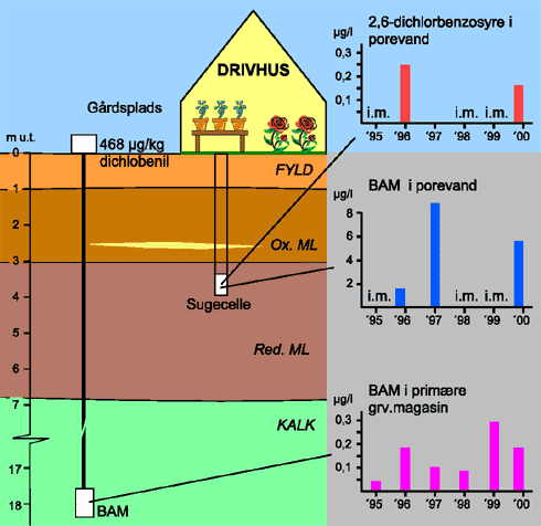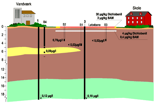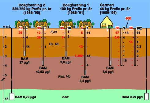 Påviste koncentrationer af BAM (sort) og dichlobenil (rød) i jord (enhed µg/kg), porevand og grundvand (enhed µg/l) i Hvidovre. Geologien er indtegnet meget skematisk.