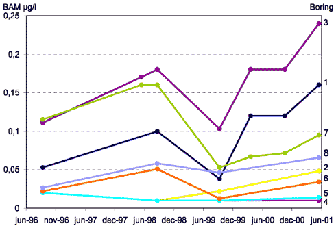 BAM-koncentrationerne i grundvandsmagasinet synes i store træk at have ligget på et relativt stabilt niveau, siden det blev konstateret tilbage i 1995. BAM-indholdet som funktion af tiden er vist for udvalgte boringer i figur 4.2. Der er konstateret indhold af BAM på maksimalt 0,79 µg/l i grundvandsmagasinet i DGU-boring 208.320A. Denne boring blev taget ud af drift i år 2000, hvorefter der er sket et markant fald i BAM-koncentrationen i boringen til 0,3 µg/l i år 2000.