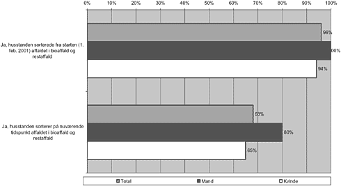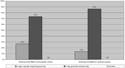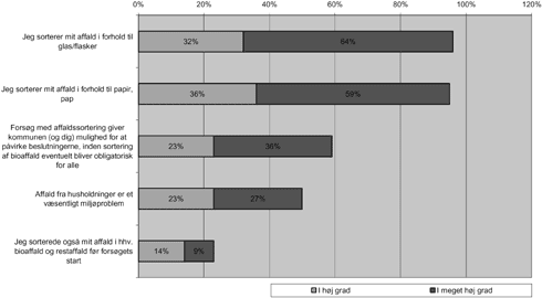 Generel holdning til affald og miljø (n=22) Halvdelen (50%) angiver, at affald fra husholdninger i høj eller meget høj grad er et væsentligt miljøproblem. 59% af brugerne angiver, at forsøg med affaldssortering i høj eller meget høj grad giver mulighed for at påvirke beslutningerne vedrørende sortering af bioaffald. Stort set alle brugerne (96%) angiver at de i høj eller meget høj grad sorterer deres affald i forhold til glas og flasker, mens en smule færre (95%) sorterer i forhold til papir og pap. Kvinderne er bedre til at sortere i forhold til både pap/papir og glas/flasker end mændene. Stort set alle (96%) af brugerne vurdere at de sorterede affaldet i bio- og restaffald fra starten (1. feb. 2001), men niveau er siden faldet til 28%-point til 68% .