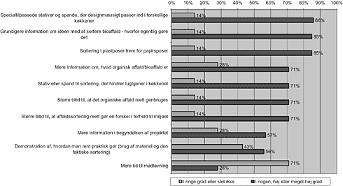Har husstanden i forbindelse med forsøget... (n=21) Naturligt nok har en større del af de brugere, der angiver at de sorterer deres affald, læst sorteringsvejledningen, det skriftlige informationsmateriale og nyhedsbrevene i forhold til de brugere, der ikke sorterer deres affald. Der er en generel tendens til at mændene i forhold til kvinderne i højere grad angiver at de har læst de forskellige former for informationsmateriale. Den proaktive supplerende informationssøgning i form af deltagelse i informationsmøder, kontakt til kommune og/eller renovationsfirma samt søgning på Internettet er generelt lav (under 10%). En stor del af brugerne (81%) har givet udtryk for at informationen forud for forsøget var tilstrækkelig. Kun 14% har angivet, at informationen slet ikke var tilstrækkelig. 87% vurderer tillige, at den skriftlige information i løbet af forsøget i høj eller meget høj grad har været let forståelig. Mændene har i højere grad end kvinderne fundet den skriftlige information let forståelig 3.3. MaterielDer er generelt tilfredshed med forholdene vedrørende det udleverede materiel og forløbet omkring udleveringen. Tilfredshed med forskellige forhold vedrørende det udleverede materiel og forløbet omkring udleveringen (n=15) Over 40% angiver dog at være utilfredse eller meget utilfredse med størrelsen af beholderen til udendørs opsamling, kvaliteten af pose/elastik til brug i køkkenet, placeringen af plads til fælles opsamlingaf bioaffald samt med valgmulighederne i forhold til materiellet. Endvidere angiver 33% at være utilfredse eller meget utilfredse med størrelsen af posen/ spanden til brug i køkkenet, kvaliteten af opsamlingsmateriellet og placeringen af pladsen til den fælles opsamling af bioaffaldet. 3.4. IndsamlingsforløbForsøget har været medvirkende til at sortering af bioaffald pt. føles en smule mindre besværligt end det gjorde ved forsøgets start.