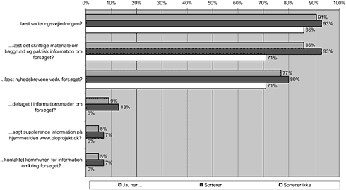 En stor del af brugerne har læst sorteringsvejledningen (91%), og næsten lige så mange (86%) har læst det skriftlige informationsmateriale om forsøget. Godt ¾ har læst nyhedsbrevene vedrørende forsøget.