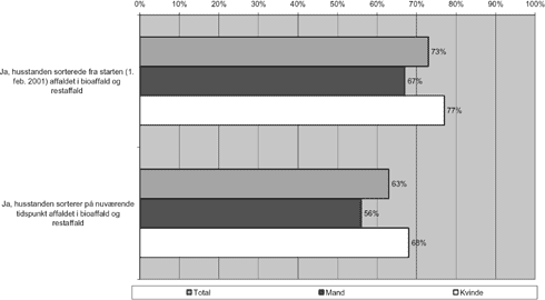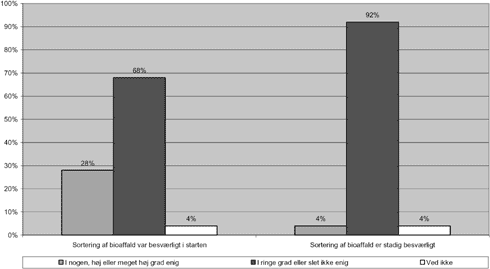 Generel holdning til affald og miljø (n=40) 55% angiver, at affald fra husholdninger i høj eller meget høj grad er et væsentligt miljøproblem. 60% af brugerne vurderer, at forsøget med affaldssortering i høj eller meget høj grad giver mulighed for at påvirke beslutningerne vedrørende sortering af bioaffald. En stor del af brugerne (89%) angiver, at de i høj eller meget høj grad sorterer deres affald i forhold til glas og flasker, mens lidt færre (78%) svarer, at de sorterer i forhold til papir og pap. Omkring ¾ af brugerne (73%) har svaret, at de sorterede affaldet i bio- og restaffald fra starten (1. feb. 2001), men siden er dette niveau faldet med 10%-point til 63%.