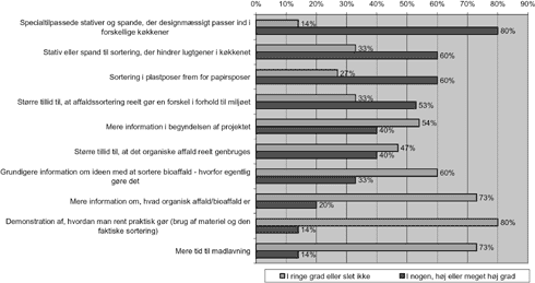 Har husstanden i forbindelse med forsøget... (n=40) Naturligt nok angiver en større del af de brugere, der sorterer deres affald, at have læst sorteringsvejledningen og det skriftlige informationsmateriale i forhold til de brugere, der ikke sorterer deres affald. Overraskende angiver en større del af de ikkesorterende brugere at have læst nyhedsbrevene vedrørende forsøget i forhold til de brugere, der sorterer deres affald. Den proaktive supplerende informationssøgning er generelt lav (under 10%). Ingen af de brugere, der ikke sorterer deres affald, angiver at have søgt yderligere information på Internettet, eller taget kontakt til kommunen eller renovationsfirmaet i forbindelse med forsøget. Godt ¾ af brugerne (76%) har vurderet, at informationen forud for forsøget var tilstrækkelig. 8% har angivet, at informationen i ringe grad eller slet ikke var tilstrækkelig. 88% har angivet, at de i høj eller meget høj grad fandt den skriftlige information i løbet af forsøget let forståelig. 8.3. MaterielDer er generelt stor tilfredshed med forholdene vedrørende det udleverede materiel og forløbet omkring udleveringen. Tilfredsheden med forskellige forhold vedrørende det udleverede materiel og forløbet omkring udleveringen (n=28) 16% af brugerne angiver dog at være utilfredse eller meget utilfredse med kvaliteten af pose og evt. elastik til brug i køkkenet. Endvidere angiver 12% at være utilfredse eller meget utilfredse med valgmulighederne i forhold til materiellet. 8.4. IndsamlingsforløbForsøget vurderes at have været medvirkende til, at sortering af bioaffald føles langt mindre besværligt ved forsøgets afslutning, end det gjorde ved forsøgets start.