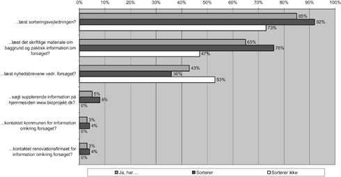 En stor del af brugerne angiver at have læst sorteringsvejledningen (86%), og knap 2/3 svarer, at de tillige har læst det skriftlige informationsmateriale om forsøget. 43% mener, at de har læst nyhedsbrevene vedrørende forsøget.