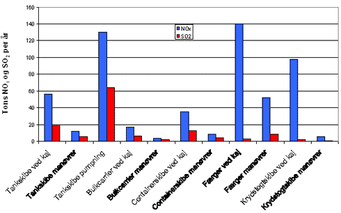 I de følgende afsnit er beregninger af effektforbrug og emissioner vist i tabeller og grafisk. Alle de i bilag viste værdier er uafrundede, uden at dette må tages som udtryk for præcisionen i vurderingerne. 5.1 Københavns HavnI bilag A ses beregninger af effektforbruget for samtlige skibe ved kaj til lys, ventilation etc. men uden pumpning af flydende gods. I samme bilag ses beregningerne af emissioner. I tabel 3 i Skibsfarten på danske havne 2001 er det oplyst, at der i Københavns Havn er lastet/losset i alt 3.027.000 tons flydende gods i/fra tankskibe. Denne mængde pumpes ved hjælp af skibenes egne pumper under et forbrug på 0,7 kg olie per ton pumpet gods. Det antages, at der til 0,2 kg olie svarer 1 kWh. Den anvendte olie er af samme type som på hovedmotoren. Beregninger af effektforbrug og emissioner ved manøvrer i havnen og pumpning af flydende gods ses i bilag B. I tabel 5.1 ses de samlede emissioner fra alle driftsformer. Tabel 5.1