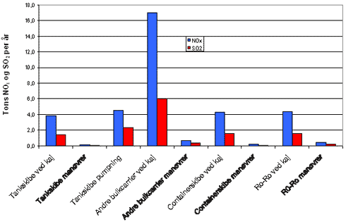 * Ikke middel men sum For fragtskibe er tabel 4 i Skibsfarten på danske havne 2001 anvendt til at beregne antal og gennemsnitsstørrelser. For krydstogtskibe beregnes effektforbruget og emissionerne forholdsmæssigt for det samlede antal (257) i forhold til de 201, der indgår i beregningerne for København. Rønne og Århus er de eneste øvrige havne, hvor krydstogtskibe lægger til. For tankskibe beregnes forbruget til losning og lastning af den samlede mængde flydende gods i de 21 havne, som udgør 95% af alt flydende gods i Danmark (32.622.000 tons). I bilag G ses beregninger af effektforbruget for samtlige skibe ved kaj til lys, ventilation etc. men uden pumpning af flydende gods. I samme bilag ses beregningerne af emissioner. Beregninger af effektforbrug og emissioner ved manøvrer i havnen og pumpning af flydende gods ses i bilag H. Resultaterne for de 21 havne ses i tabel 5.6 og emissionen af NOx og SO2 er illustreret i figur 3. Tabel 5.6