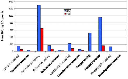 Figur 2 Den klart størst kilde til emission af NOx er andre bulkcarriers ved kaj (49%), mens ingen af de øvrige kilder bidrager med mere end 13%. Andre bulkcarriers er ligeledes den største kilde til emission af SO2 (43%), mens pumpning fra tankskibe er årsag til 16%.