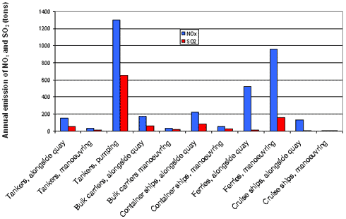 Emissions from ships in port Summary and conclusionsThe present report is prepared in order to determine the magnitude of emissions from ships in three Danish ports and for the entire country. Based on two international reports about ship emissions and on Danish publications about this matter as well as discussions with relevant experts comprehensive information about the traffic handled by three selected Danish ports has been gathered. A number of assumptions concerning motor size, energy consumption and duration of stay in port for different types of ships have been made. Auxiliary engines on board ships are main contributors to the total emissions. The equation used for calculating the emissions from ships consists of five terms each having an uncertainty. The total uncertainty is estimated to be less than 100%. The investigation shows that the Port of Copenhagen has the largest absolute emissions. The main contributors to the emission of NOx are ferries alongside quay (25%), unloading of tankers (23%) and cruise ships alongside quay (18%). Manoeuvring of ships within the port accounts for 15% of the total emission of NOx. The Port of Køge is handling a relatively smaller number of tankers than the port of Copenhagen. The main contributor to the emission of NOx is therefore other bulk carriers alongside quay (49%). In the Port of Elsinore manoeuvring of ships accounts for about 73% of the total emission of NOx. The mean time for manoeuvring is about 6 minutes and the mean time for staying alongside quay is about 10 minutes for each in-coming ship. Ferries in regular operation featured by short stays in port as in the case of Elsinore are not able to make use of land-based electricity supply. However, in the Port of Køge electricity supply is available to ships from outlets placed at the quay. Only few ships take advantage of this possibility. The study shows that an essential part of the emissions can be transferred from the port to the power stations provided a higher utilisation of electricity from outlets placed in the port. The Port of Copenhagen presents a potential for a large-scale relative reduction of emissions. Emissions of NOx from cruise ships and ferries alongside quay account for about 43% of the total emission of NOx. The total emissions from the three selected ports are shown in the table below.