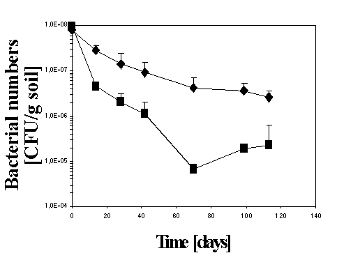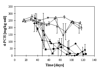 Figur 4: I bakterier, der indeholder bph genkomplexet, omdannes PCBer via chlorbenzoater. Det er endvidere bekendt fra litteraturen, at chlorbenzoaterne frigives af bakteriecellerne. Det blev i projektet bekræftet, at stammen F113rifpcb danner og frigiver chlorbenzoater som forventet. Det blev desuden påvist, at mono-, di- og trichlorbenzoater optages hurtigt i pileplanter (figur 5). Idet TSCF er næsten konstant med tiden, er optagelsen primært afhængig af vandforbruget, som tolkes som bevis for hurtig (passiv) optagelse af chlorbenzoat. Det betyder, at chlorbenzoater, der dannes under nedbrydning af PCBer ved gensplejsede stammer af Pseudomonas fluorescens F113 i rodzonen af planter, vil fjernes fra jordvæsken. De producerede chlorbenzoater bliver dermed ikke til et miljøproblem. Desuden antyder de seneste resultater, at Pseudomonas fluorescens F113 selv nedbryder chlorbenzoater. Dette forløbige resultat er en overraskelse og bliver undersøgt videre. Figur 5: E. Detektionsmetoder. Udvikling af detektionsmetoder for specifikt at overvåge de gensplejsede bakterier i forbindelse med udsættelses-forsøg er kommet til et punkt, hvor metoderne er klar til brug. Genafsnit på begge sider af bph genkompleksen i den genmodificerede stamme Pseudomonas fluorescens F113rifpcb blev sekventeret og dernæst blev der udviklet en PCR (polymerase kædereaktion)-baseret metode for påvisning og kvantificering af bakteriestammen i jord. Tilsvarende blev der udviklet en metode for stammen Pseudomonas fluorescens F113lacZY, som er baseret på en unik sekvens i overgangen mellem det indførte genkomplex og kromosomet af vildtypen. F. Sikkerhedsstudie og udsætningsansøgning: Genmodificeret Pseudomonas fluorescens F113 var i stand til at overleve på døde rødder og at re-etablere sig på rødderne af nye planter, der efter tre ugers ventetid blev plantet i den samme jord. Det betyder at fjernelse af vegetation ikke fuldstændigt vil fjerne bakteriestammen i tilfælde, at man ønsker at fjerne den fra jorden. Det betyder dog også, at bakteriestammen kan anvendes effektivt, idet den efter podning overlever godt i jord. Før i tiden har der været vanskeligheder med andre laboratoriestammer, som ikke overlevede tilstrækkeligt efter podning i forurenet jord. I forsøg med tilsætning af genmodificeret Pseudomonas fluorescens F113 til henholdsvis forurenet jord eller pilestiklinger (plantet i forurenet jord), blev der med pil vedligeholdt mere end 10 gange så mange celler af bakteriestammen per jordmasse end uden pil (figur 2). Det bekræfter, at anvendelse af vegetation er en væsentlig del af teknologien for at etablere og vedligeholde et højt antal af disse bakterier i jord. Samtidig betyder det også, at fjernelse af vegetation nedsætter antallet af bakterierne med mere end en faktor 10 indenfor få uger. I såvel jord med som uden planter, etablerede genmodificeret Pseudomonas fluorescens F113 sig med et vis bakterietal per jordmasse. Antallet var efter nogle måneder relativ stabilt og blev kun langsomt mindre. Det er aldrig sket, at genmodificerede Pseudomonas fluorescens F113 stammer ville vokse usædvanligt i jord, og på intet tidspunkt overstiger bakterietallet det niveau, der er set for andre jordbakterier. Rodkolonisering og bakterieantal per jordmasse var de samme med og uden PCBer, med såvel stamme F113 som stamme F113rifpcb. Det viser, at indsplejsning af bph-generne ikke har indflydelse på, hvordan Pseudomonas fluorescens F113 overlever i miljøet. Et økologisk felt-studie med udsættelse af de genmodificerede stammer Pseudomonas fluorescens F113lacZY og Pseudomonas fluorescens F113rifpcb er planlagt og forberedt. Stammernes økologiske karakterisering er afsluttet og resultaterne er blevet fremlagt i en ansøgning om et udsættelses-forsøg. Ansøgningen er under behandling i Skov- og Naturstyrelsen. Miljøministerens afgørelse afventes.