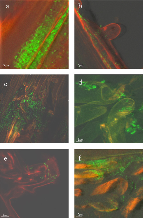 Bioremediering ved hjælp af planter og gensplejsede bakterier 3 Oversigt over resultaterneA. Aktivitet og genekspression i rodzonen: Måling af den metabolske aktivitet af Pseudomonas fluorescens F113rifpcb ved hjælp af markerede modelbakterier viste, at bakteriestammen kun vokser i den umiddelbare nærhed af rodspidserne. Det betyder, at den metabolske aktivitet af de celler af Pseudomonas fluorescens F113rifpcb, som ikke sidder på en rodspids, er lav. Dette er en overraskelse, idet man havde forventet, at alle bakterier i rodzonen har høj aktivitet. Men det i sig selv vil ikke betyde, at bakteriernes nedbrydningsaktivitet også er lav. (Se i den forbindelse resultaterne under punkt D). Det viste sig, som forventet, at stammen F113rifpcb kun har en lav ekspression af bph genkompleks, d.v.s. dennes nedbrydningsaktivitet er på lavt niveau. Det skyldes, at stammen var verdens første forsøg på at gensplejse denne type bakteriestammer, og der derfor ikke blev brugt de allernyeste metoder for at forøge genekspressionen. Man var altså dengang tilfreds med gensplejsningen, hvis stammen overhovedet viste aktivitet, hvilket den gjorde. Forøget ekspression af bph genkompleks blev opnået med konstruktion af den nye stamme Pseudomonas fluorescens F113L:1180, hvori en genregulator fra Sinorhizobium meliloti anvendes. Men som en stor overraskelse er regulatoren i Pseudomonas fluorescens F113 altid aktiv. Det var forventet, at den sætter genekspression under kontrol af rodeksudater (fra lucerne), dvs. den nye Pseudomonas fluorescens F113L::1180 forventedes kun at være aktiv i rodzonen af lucerne. Faktisk er den dog aktiv i alle nicher, og den er betydelig mere aktiv end stammen F113rifpcb. Stammen Pseudomonas fluorescens F113 L::1180, der er splejset med den alternative genregulator for at styrke bph genekspression, gennemførte i renkultur omdannelsen af 4-PCB til 4-chlorbenzoesyre betydeligt hurtigere end stammen Pseudomonas fluorescens F113rifpcb. Den sidstnævntes bph genekspression er styret af den naturlige genregulator af bph genkomplekset. Måling af nedbrydnings-aktivitetet af Pseudomonas fluorescens F113rifpcb ved hjælp af markerede modelbakterier viste, at bakteriestammen omdanner 3-PCB til 3-chlorbenzoesyre i rodzonen af lucerne. Cirka 1% af bakteriecellerne var målbare aktive. Resultatet var overraskende lavt, men det må tages i betragtning, at målemetoden underestimerer antallet af aktive bakterier. Det blev desuden påvist, at nedbrydningen ikke kun skete i særlige rodafsnit (f.eks. rodspidserne), men lige kraftigt i alle afsnit af rodoverfladen. Dette resultat viser, i forbindelse med de andre resultater beskrevet i dette kapitel, at nedbrydningsaktiviteten i den gensplejsede bakteriestamme Pseudomonas fluorescens F113rifpcb ikke er afhængig af niveauet af bakteriecellernes almindelige celle-metabolisme. Med andre ord, bakterien kan nedbryde 3-PCB selvom den ikke er i gang med at vokse. B. Begrænset overlevelse af de podede bakterier: Selvom der blev udviklet stammer af Pseudomonas fluorescens F113 med begrænset overlevelse, afsluttede projektet ikke konstruktionen af en bakteriestamme med overlevelse under kontrol af rodeksudater. C. Podningsmetoder: Metoder for effektiv podning af planterødder til anvendelse i fytoremediering blev udviklet og er klar til brug. Metoderne bygger på, at bakterierne dyrkes i renkulturer og blandes med et fugtigt bæremateriale. Derefter bruges bærematerialet som pilleringsmasse til plantefrø. Enkelte frø coates med pilleringsmassen og tørres straks derefter. Pillernes fugtighed justeres så de er fugtige nok til at bakterierne overlever, men tørre nok til at frø ikke spirer. Detaljerne af proceduren, især sammensætningen er bærematerialet, er hemmeligholdte opskrifter af en af projektets partnere. Pseudomonas fluorescens F113 podet på lucerne-frø eller pilestiklinger koloniserede hele overfladen af roden, som enkelte celler eller mikrokolonier. Dette blev påvist med lucerne ved hjælp af mikroskopi, som vist i figur 2. Bakterierne, som på billederne er lysegrønne, blev oftest set i linier svarende til overgangene mellem rod epidermis celler (2a) og ved bunden af rod hår (2c) og siderødder (2b). Der blev også fundet bakteriekolonier fordelt på overfladen af siderødderne og rod hår (2b, 2c, 2d, 2e). Det vigigste var, at bakteriecellerne også fandtes i mucigel på rodspidserne (2f). Tilsvarende mikroskopiske observationer blev lavet med pilerødder (billederne er ikke vist). Antallet af cellerne af stamme F113 blev kvantificeret i forsøg med PCB-forurenet jord (figur 1). I såvel jord med pil, som i plantefri jord, var der et betydeligt fald i bakterietallet i tiden efter inokulering, men med pil var aftagelsen omkring en faktor 10 langsommere end uden pil. Det konkluderes, at Pseudomonas fluorescens F113 kan podes på lucerne og pil for at etablere bakteriestammen i PCB-forurenet jord.