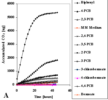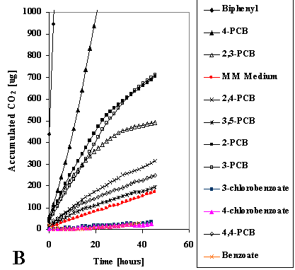 Figur 3 (A): I laboratorie-eksperimenter med 4-PCB forurenet jord, pil og bakterier blev forureningen hurtigt fjernet (figur 4). Der kunne ikke ses en effekt af den podede stamme Pseudomonas fluorescens F113rifpcb. Dette skyldes formentlig en hurtig optagelse i planten. Dette kan forklares ved hjælp af en ny matematisk model, som forudsiger, at organiske stoffer med en logKow under 5 optages i planter. Højere klorerede PCBer har en betydelig højere logKow og vil sandsynligvis ikke optages i planter, men effekten af Pseudomonas fluorescens F113rifpcb ved disse forbindelser er ikke undersøgt endnu.