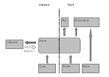 *) Foder omfatter foruden selve fuldfoderet også grovfoder, strøfoder og skaller **) N afsat i stald = (N ab dyr + N i halm) – N på udearealer I delforsøg 3-5 er der beregnet en negativ afsætning af fosfor på udearealerne. Det betyder, at der ved analyserne er fundet mere fosfor i dybstrøelsen og aflejret i æggene, end der er tilført med foder og halm. Massebalanceberegningerne bygger på stikprøvevis udtagning af prøver af foder, dybstrøelse m.v. til analyse, og stikprøver vil altid være behæftet med en vis usikkerhed. Desuden vil der på den tid af året, hvor der er græsvækst, være et betydeligt usikkerhedsmoment, da græsmængden og dermed fosfor og kvælstofbidraget fra græs, er uhyre vanskelig at bestemme. Usikkerheden omkring kvælstof- og fosforbidraget fra græs spiller imidlertid ikke ind i delforsøg 5-7, hvor fosforafsætningen på udearealerne bestemmes til en negativ værdi, da de alle ligger i vintermånederne og det tidlige forår. En anden forklaring end metodeusikkerhed kan derfor være, at hønsene udnytter en fosforkilde på udearealerne, som der ikke er taget højde for i undersøgelsen. Tages de beregnede værdier for fosforafsætning på udearealerne for pålydende, betyder en "negativ" afsætning på friland at der er "importeret" fosfor fra udearealerne til dybstrøelsen. Det vil i givet fald betyde, at hønerne på udearealerne henter fosfor fra andre fødeemner end græs. Videre vil det betyde, at den i tabel 3 og tabel 5 anførte værdi for fosfor på udearealer angiver størrelsen af nettoeksporten af fosfor fra stald til udearealer ( figur 3) i stedet for specifikt at angive størrelsen af fosfordeponeringen på udearealer. I balanceberegningen skal fosforinputtet balancere med fosforaflejringen i æg og fosforoutputtet på friland og i dybstrøelsen. Hvis fosforinputtet er underestimeret, vil det medføre en tilsvarende underestimering af fosforafsætningen på friland. Dermed bliver andelen af gødning afsat på friland bestemt til for lav en værdi. Hvis hønsene udnytter en ukendt fosforoptag på friland må det dog formodes, at der samtidig sker en optagelse af kvælstof. Effekten på det beregnede kvælstoftab vil afhænge af forholdet mellem fosfor og kvælstof (N/P forholdet) i den ukendte kilde. Hvis N/P forholdet i kilden svarer til N/P forholdet i gødningen ab dyr, vil det relative kvælstoftab fra stalden være uændret. Hvis N/P forholdet i kilden overstiger N/P forholdet i gødningen, vil det relative N-tab blive større end beregnet i tabel 3 og 5. Figur 3. Fosforflowet i produktionsanlægget II (jf. figur 2)