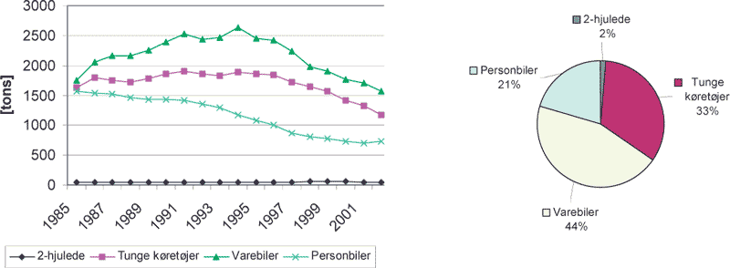 Figur 3-2 Udviklingen i vejtrafikkens partikelemissioner (tons) fra 1985 til 2002 samt emissionsandele for 2002 pr. køretøjskategori. (Antaget at TSP=PM10=PM2.5)