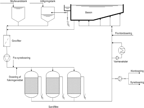I takt med, at sandkornenes overflade bliver belagt med smudspartikler, formindskes hulrummet (porerne) imellem de enkelte sandkorn. I denne tilstand er der to effekter, som overlapper hinanden, nemlig vedhæftningskraften og medrivningskraften. Når smudsbelægningen vokser i tykkelse, aftager vedhæftningskraften i de yderst siddende smudspartikler. Når vandhastigheden forbi smudslaget og sandkornene samtidig øges på grund af mindre poreåbninger, medrives en vis mængde af de yderst siddende smudspartikler. Disse partikler bliver med det gennemstrømmende vand trukket længere ned i filterlaget. Her bliver de igen bundet til endnu ikke overbelagte sandkorn, indtil der igen opstår en ligevægt mellem vedhæftningskraften og medrivningskraften. På denne måde vil der ske en gradvis mætning af filtermaterialet begyndende fra oven og langsomt arbejdende sig nedad. Flokkulering I flokkuleringsprocessen tilstræbes det at få de meget små kolloide partikler til at klumpe sammen i større og filtrerbare partikler. De kolloide partikler er normalt negativ ladet, og dermed vil partiklerne indbyrdes frastøde hinanden, så de holdes frit svævende i vandet. Ved tilsætning af et flokningsmiddel, som typisk indeholder positivt ladede hydroxider baseret på aluminium eller jern, kan forureningspartiklernes negative ladning ophæves, og der dannes flokke bestående af den positive metal-ion og de negative forureningspartikler. Herved er flokningprocessen (koaguleringen) igangsat. I forbindelse med behandling af bassinvand anvendes fortrinsvist flokningsfiltrering, dvs. et snævert samspil mellem flokning og filtrering, hvor flokningsmidlet kontinuerligt doseres før sandfilteret, således at dannelse af flokke sker i vandvoluminet umiddelbart over og i selve filtersandet. Til flokning ved vandbehandling af bassinvand anvendes almindeligvis kun aluminiumsulfat eller aluminiumhydroxidklorid, hvor sidstnævnte også kendes under betegnelsen polyaluminiumklorid. Returskylning Inden smudslaget når at arbejde sig for langt ned i filtermaterialet eller forårsager, at filterlagets øverste lag stopper til, skal smudset fjernes fra sandkornene ved en returskylning. Til dette anvendes enten luft efterfulgt af vand eller vandskylning alene. Intervallet mellem returskylningerne afhænger af smudsbelastningen, men normalt er der behov for at returskylle sandfiltre mindst én gang om ugen. Under returskylningen vil sandmassen – under påvirkning af den stærke opadgående vandstrøm – ekspandere og holde sig svævende i statisk ligevægt, mens de enkelte sandkorn inde i sandmassen ikke er i ligevægt, men er i stærk bevægelse i alle retninger og støder mod andre sandkorn, hvorved urenhederne gnides af sandkornene og føres ud med skyllevandet. Det er meget vigtigt, at der opnås en skyllehastighed, som er stor nok til at holde sandet svævende. Den nødvendige hastighed afhænger af kornstørrelsen på det valgte filtersand. Fx vil filtersand i kornstørrelsen 0,4-0,7 mm kræve en skyllehastighed på minimum 40 m/h, hvor grovere filtersand som fx 0,7-1,2 mm kræver en skyllehastighed på ca. 60 m/h. Det er også vigtigt, at der er tilstrækkelig højde i filteret til, at sandlaget kan ekspandere og holdes fluidiseret under returskylningen uden, at sandet efterhånden vaskes ud med skyllevandet. 6.1.2 Anvendelse og placeringSandfiltre placeres i hovedstrømmen i vandbehandlingsanlæg som vist i figur 6.1.2. Den cirkulerende vandstrøm, som skal filtreres, bør fordeles på så få filtre som muligt af hensyn til drift og vedligeholdelse.