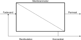 Figur 6.5.1 Principskitse for membranfiltrering af svømmebadsvand. Membranerne kategoriseres normalt efter størrelsen af porerne og størrelsen af de stoffer, som membranen tilbageholder. Der findes følgende fire kategorier af membraner listet efter faldende porestørrelse: