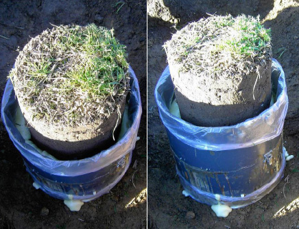 De trimmede jordkolonner blev indstøbt i polyurethancelleplast (Handelsnavn: Desmodur 44 V 40). Formålet med denne indstøbning var at stabilisere den intakte jordstruktur under al videre håndtering samt at forsegle kolonnernes sider, så der ikke her kunne foregå nogen makroporestrømning. Indstøbningen foregik løbende efterhånden som jordkolonnerne blev udgravet og trimmet. Støbeforme (40 cm i diameter og foret indvendig med plastfilm) blev placeret uden om søjlerne (Figur 1.3).