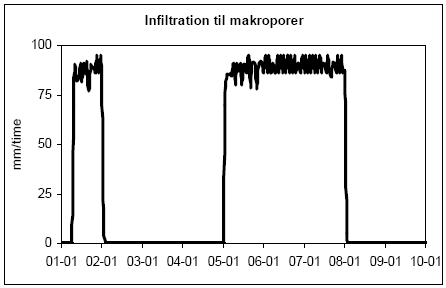 Stort set alt det vand, der løber i makroporerne fra toppen, forbliver i makroporerne helt til mættet zone (grundvand). Dette ses af Figur 1.6 og Figur 1.7, der viser, at infiltrationen til makroporer fra toppen (Figur 1.6) svarer til strømningen fra makroporer til grundvandet (Figur 1.7).