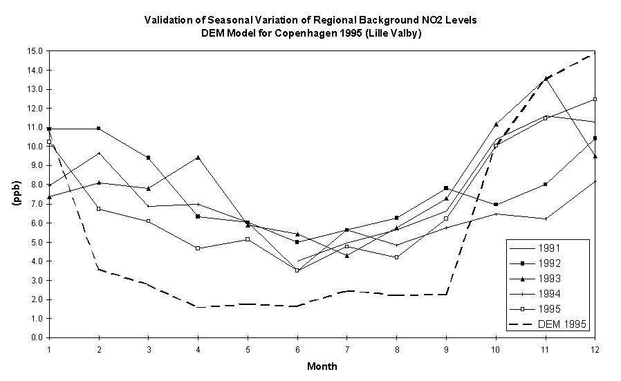 Validation of seasonal variation of NO2 regional background levels for Copenhagen at Lille Valby.