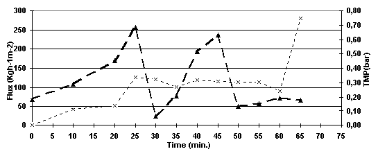 l/h/m2 (14.2°Brix). The TMP increased more significantly after 165 minutes