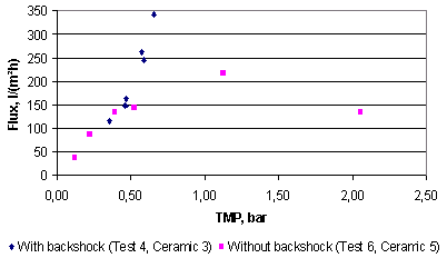 The effect of backshock on microfiltration of cherry juice can be seen in Figure 5.17. It is evident that when operating at transmembrane pressures higher than 0.5 bar, the filtration run with backshock resulted in better fluxes than the filtration run without backshock. In the filtration run without backshock and above a transmembrane pressure of 0.5 bar, the flux-pressure curve starts to deviate from linear and the increase in the pressure does not result in an increase on the flux as much as at lower pressures. It seems that there exists an optimum in the correlation flux-pressure, and that the highest flux without backshock can be achieved at a pressure of approximately 1.25 bar.