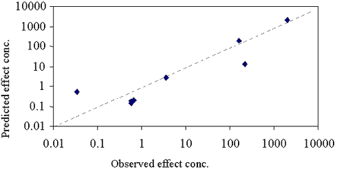 Within the observed interval the effect concentrations predicted by the PLS model were in excellent agreement with the observed effect concentrations for microalgae.