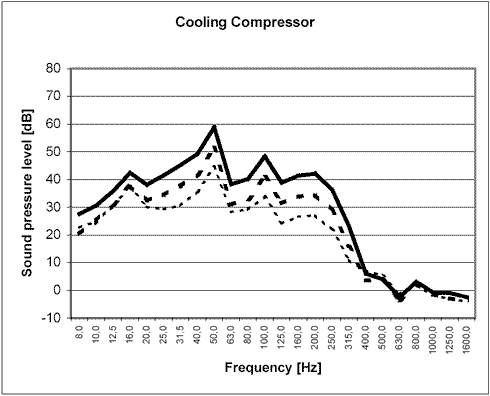 The 1/3-octave spectra of the noises are shown in the following figures. All measurements were made acoustically at the test subjects position. The spectra are show for the three nominal presentation levels: 35 dB(A) [solid line], 27,5 dB(A) [thick dashed line] and 20 dB(A) [thin dashed line].