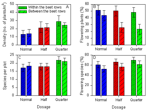This large-scale field study has illustrated that reduced pesticide dosage affects the weed vegetation in many ways and with profound impacts. A reduction in dosage, from normal to quarter dosage is followed by a considerably higher species richness and a higher density of weed plants. Furthermore, species have a higher probability to flower and set seeds at quarter dosages, so the fitness of surviving species is higher than at normal dosage. All these effects of reduced pesticide dosages on the vegetation may affect the fauna by improving the living conditions at low dosages.